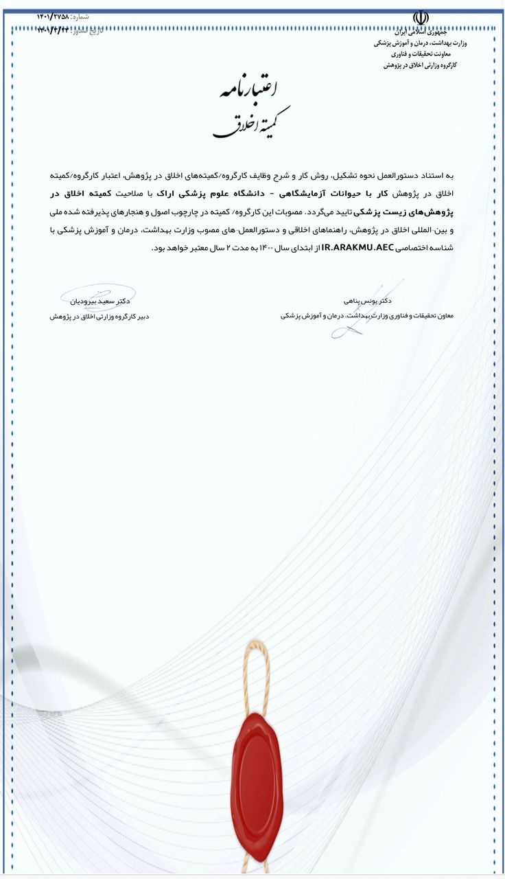 اخذ اعتبار نامه کمیته اخلاق در پژوهش کار با حیوانات آزمایشگاهی برای دانشگاه علوم پزشکی اراک ۰۱ تیر ۱۴۰۱ | ۰۷:۲۲ کد : ۲۷۲۴۶ اطلاعیه ارسال به دیگران نام شما ایمیل شما ایمیل دریافتکننده ارسال انصراف تعداد بازدید:۱۸۲۵۷