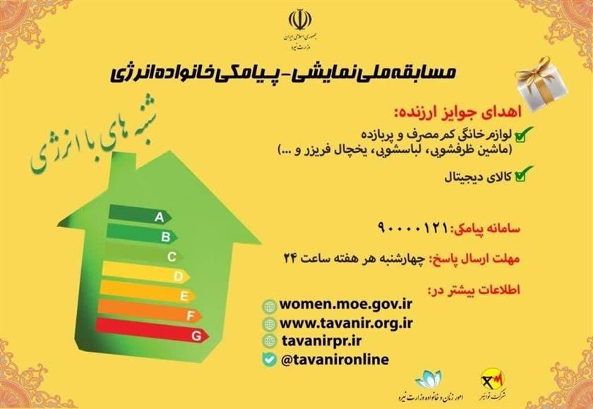 مسابقه ملی نمایشی - پیامکی خانواده انرژی ، با موضوع پیشرانی زنان در حل مسئله ناترازی انرژی ، به صورت پیامکی ، با همکاری شرکت توانیر و امور زنان و خانواده وزارت نیرو با هدف آموزش صحیح مدیریت مصرف به خانواده ها و مشارکت حداکثری آنها درایام پیک به صورت سراسری برگزار می شود.