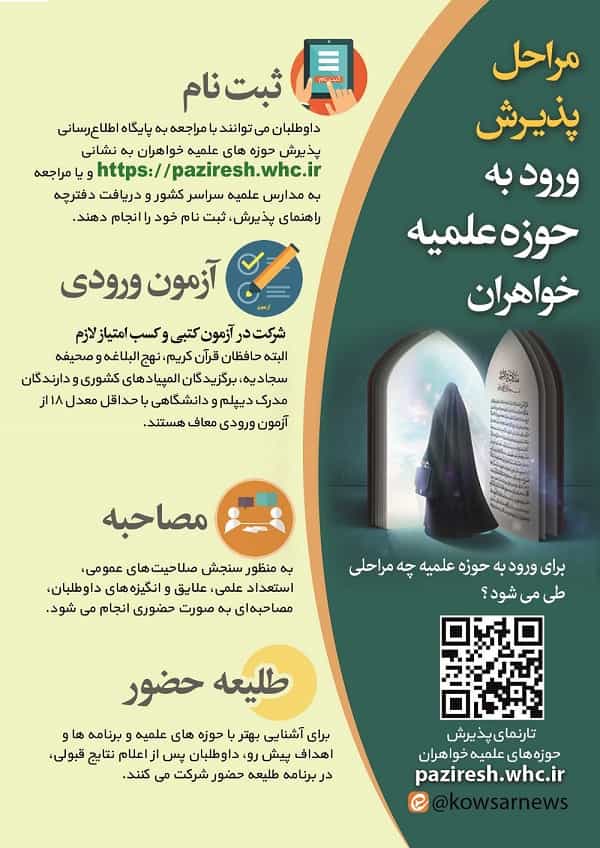 با عنایت به آغاز پذیرش حوزه های علمیه خواهران در مدارس علمیه خواهران استان برای سال تحصیلی 1404 - 1403 ، به منظور جذب خواهران ولایی و متدین  ، جزئیات ثبت نام  در بروشورهای پیوست اعلام می گردد.