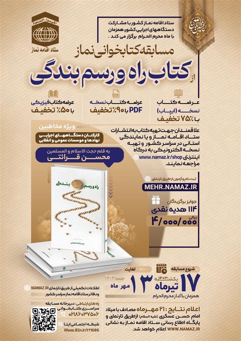 2- منبع مطالعاتی این مسابقه در دو قالب تا ۹۰ درصد تخفیف در فروشگاههای اینترنتی به نشانی ketab.namaz.ir موجود میباشد