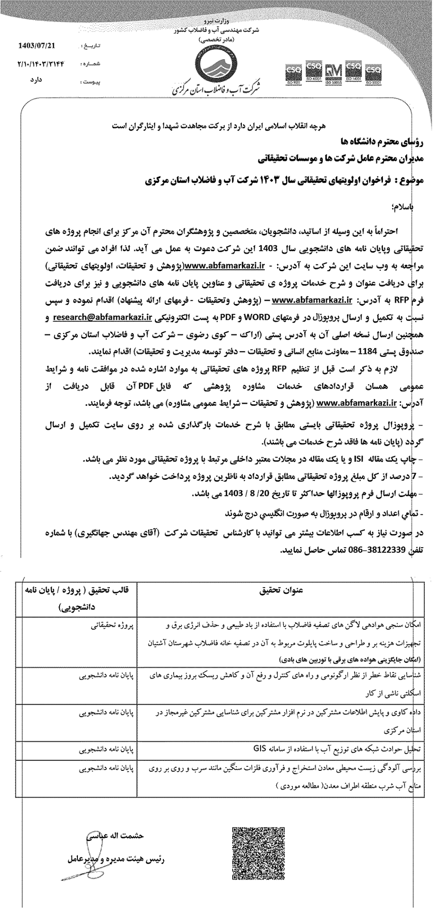 فراخوان اولویتهای تحقیقاتی شرکت آب و فاضلاب استان ۲۲ مهر ۱۴۰۳ | ۱۰:۳۵ کد : ۴۶۷۳۴ اطلاعیه ارسال به دیگران نام شما ایمیل شما ایمیل دریافتکننده ارسال انصراف تعداد بازدید:۱۱۸۶۱ فراخوان اولویتهای تحقیقاتی سال ۱۴۰۳ شرکت آب و فاضلاب استان مرکزی