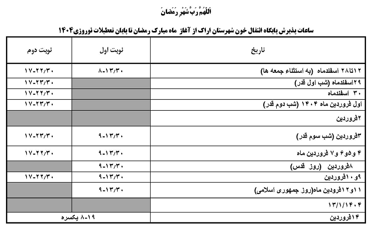 اعلام ساعات پذیرش اهدا کنندگان محترم در پایگاه انتقال خون شهرستان در ماه مبارک رمضان ۲۸ اسفند ۱۴۰۳ | ۱۳:۰۸ کد : ۵۰۲۶۹ اطلاعیه ارسال به دیگران نام شما ایمیل شما ایمیل دریافتکننده ارسال انصراف تعداد بازدید:۷۷۷۷ اعلام ساعات پذیرش اهدا کنندگان محترم در پایگاه انتقال خون شهرستان در ماه مبارک رمضان