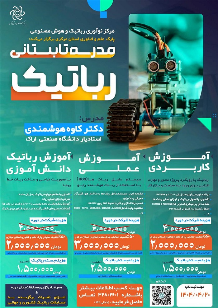 مرکز نوآوری رباتیک و هوش مصنوعی پارک علم و فناوری استان مرکزی، مدرسه تابستانی رباتیک را با تخفیف ویژه برگزار می نماید.