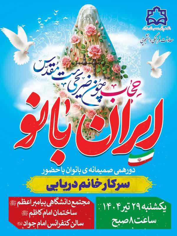 به اطلاع می رساند معاونت فرهنگی و دانشجویی دانشگاه، ضمن گرامیداشت فرارسیدن هفته ملی عفاف و حجاب، جهت شرکت در ویژه برنامه ایران بانو که با حضور استاد سرکار خانم دریائی برگزار می گردد (دورهمی صمیمانه بانوان) دعوت به عمل می آورد.