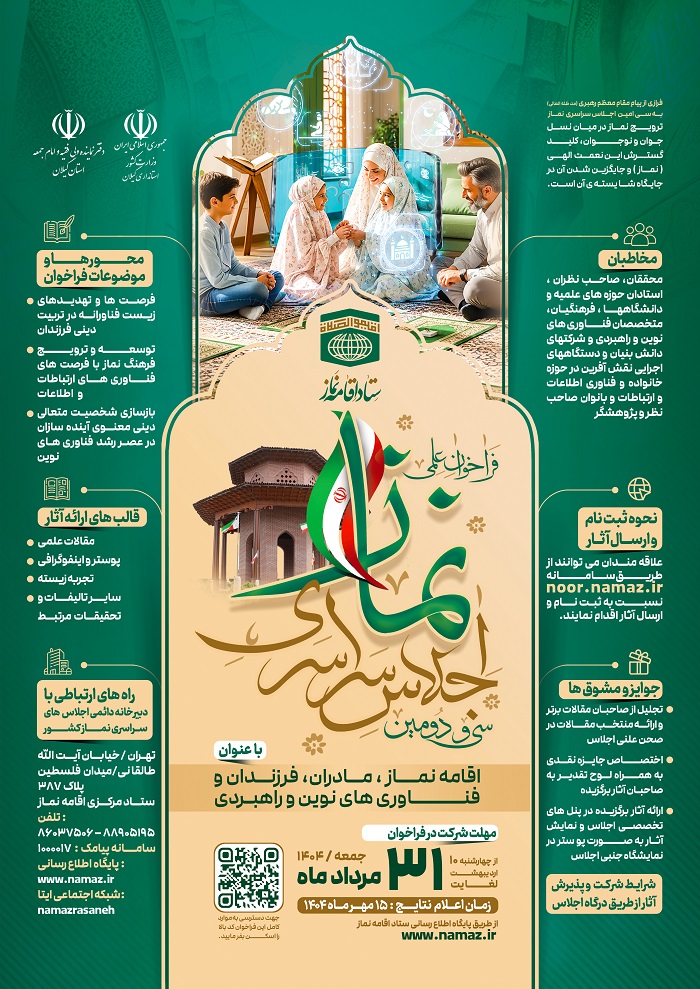 ستاد اقامه نماز استان مرکزی، سی و دومین اجلاس سراسری نماز با عنوان اقامه نماز، مادران، فرزندان و فناوری های نوین و راهبردی را برگزار می نماید.