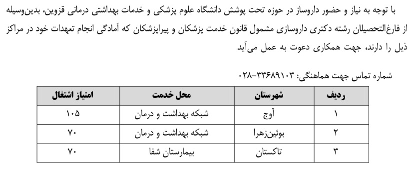 جذب نیروی داروساز مشمول قانون خدمت ۲۵ آذر ۱۴۰۴ | ۰۹:۰۰ کد : ۵۷۰۵۷ اطلاعیه ارسال به دیگران نام شما ایمیل شما ایمیل دریافتکننده ارسال انصراف تعداد بازدید:۱۹۵۳ جذب نیروی داروساز مشمول قانون خدمت در دانشگاه علوم پزشکی قزوین