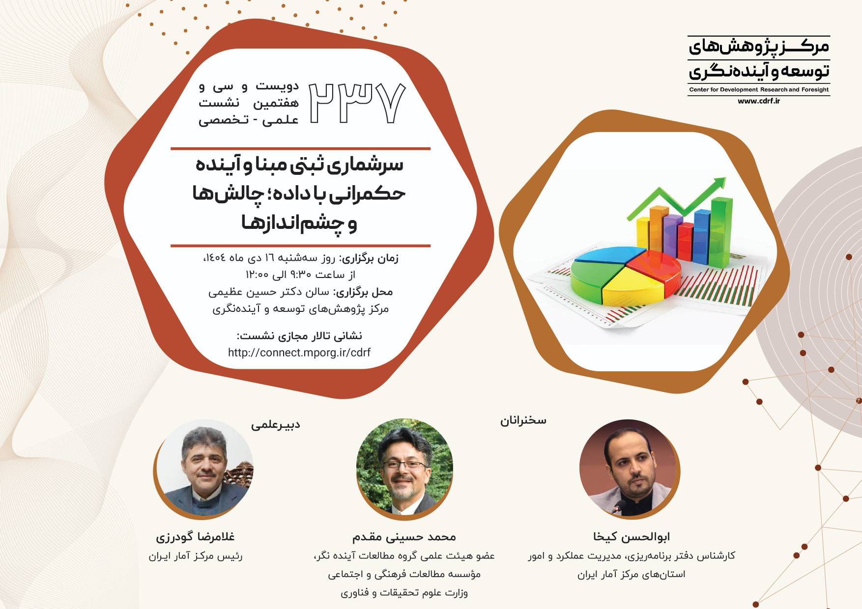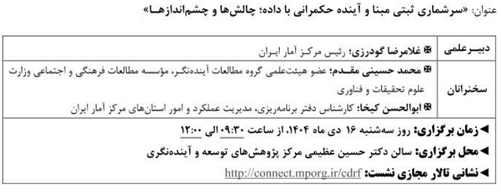 نشست علمی سرشماری ثبتی مبنا آینده حکمرانی با داده ۱۴ دی ۱۴۰۴ | ۱۰:۲۱ کد : ۵۷۴۱۸ اطلاعیه ارسال به دیگران نام شما ایمیل شما ایمیل دریافتکننده ارسال انصراف تعداد بازدید:۵۶۵ دویست وسی وهفتمین نشست علمی - تخصصی با عنوان سرشماری ثبتی مبنا آینده حکمرانی با داده، چالش ها وچشم اندازها