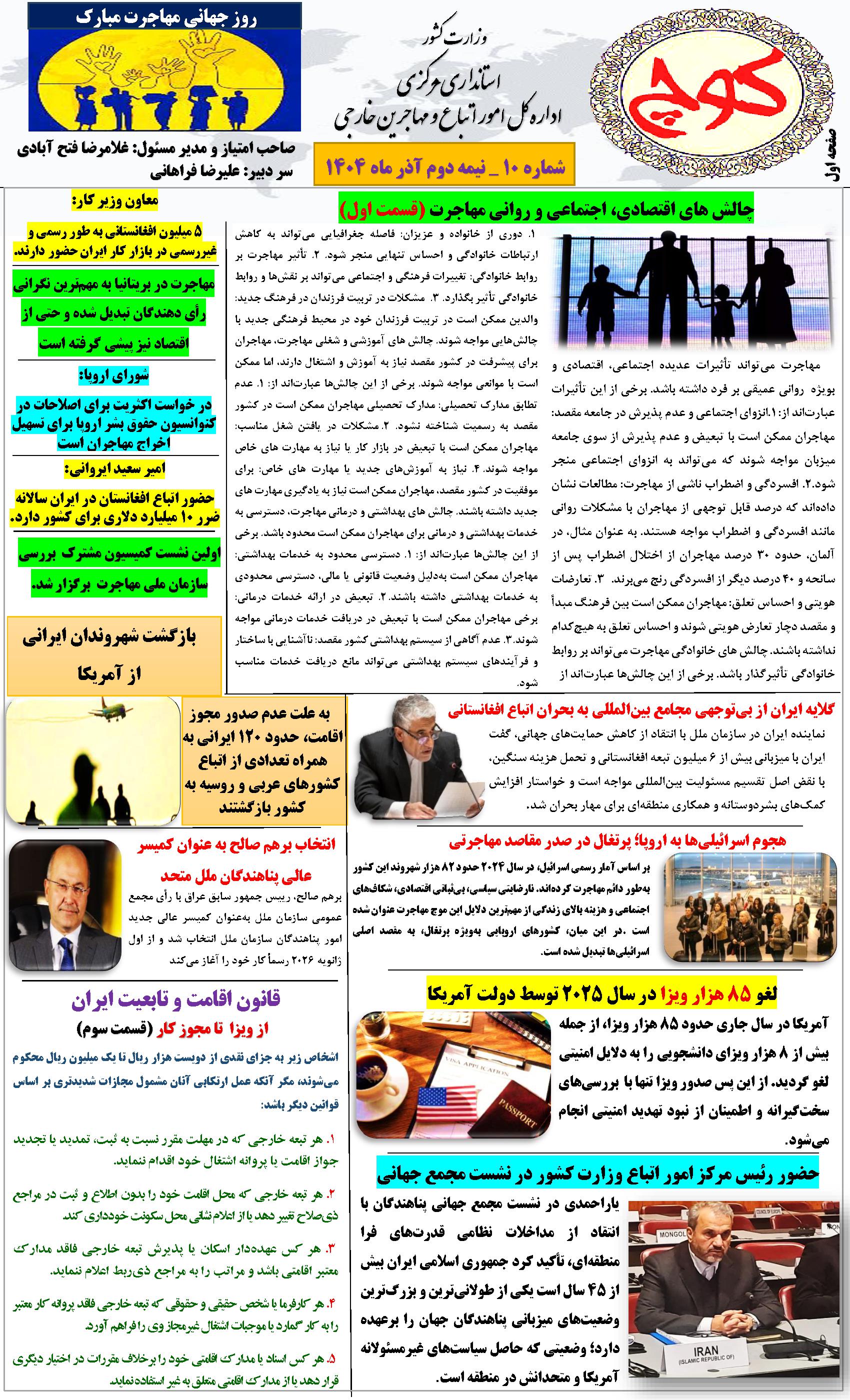 دهمین شماره نشریه کوچ ۰۳ دی ۱۴۰۴ | ۰۹:۲۱ کد : ۵۷۵۲۰ اطلاعیه ارسال به دیگران نام شما ایمیل شما ایمیل دریافتکننده ارسال انصراف تعداد بازدید:۱۱۲ دهممین شماره نشریه کوچ، توسط دفتر امور اتباع و مهاجرین خارجی استان مرکزی منتشر گردید.