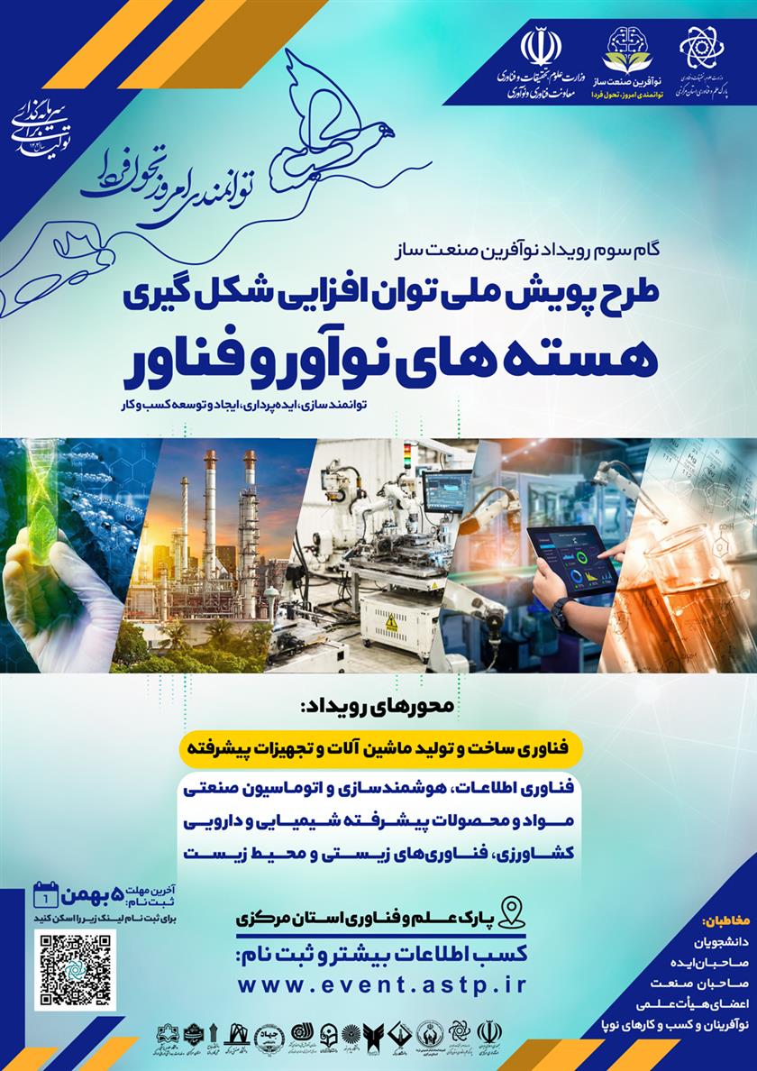 به اطلاع می رساند با توجه به تفاهم نامه دانشگاه علوم پزشکی اراک با پارک علم و فناوری استان مرکزی ، سومین گام طرح پویش ملی نوآفرین «صنعت‌ساز» استان مرکزی برگزار می گردد.