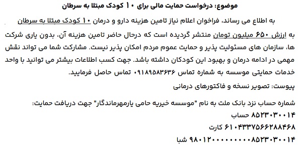درخواست حمایت مالی، برای ۱۰ کودک مبتلا به سرطان ۰۷ بهمن ۱۴۰۴ | ۱۱:۳۳ کد : ۵۷۷۳۲ اطلاعیه ارسال به دیگران نام شما ایمیل شما ایمیل دریافتکننده ارسال انصراف تعداد بازدید:۱۷۵ موسسه خیریه حامی یار، درخواست حمایت مالی، برای ۱۰ کودک مبتلا به سرطان را دارد.