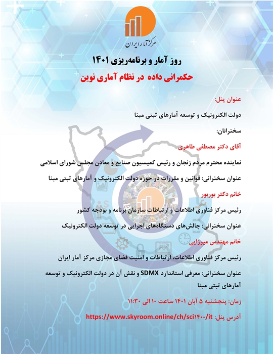 این پنل تخصصی در پنجمین روز از هفته آمار و برنامهریزی، روز پنجشنبه،پنجم آبان ماه توسط مرکز آمار ایران صورت مجازی برگزار میشود.
