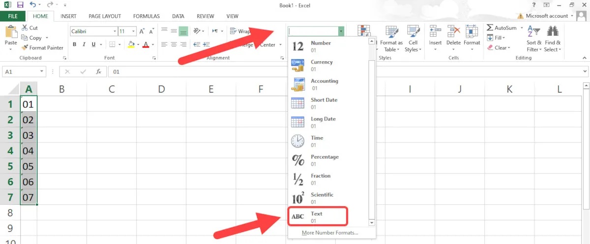 اگر میخواهید اعداد را بلافاصله در زمان تایپ با همان صفر آغازین درون سلولها نمایش دهید، باید فرمت سلولها را تغییر دهید. برای مثال، در یک سلول 01 را تایپ کنید و سپس فرمت سلول را به Text تغییر دهید. برای این منظور طبق مراحل زیر پیش بروید: