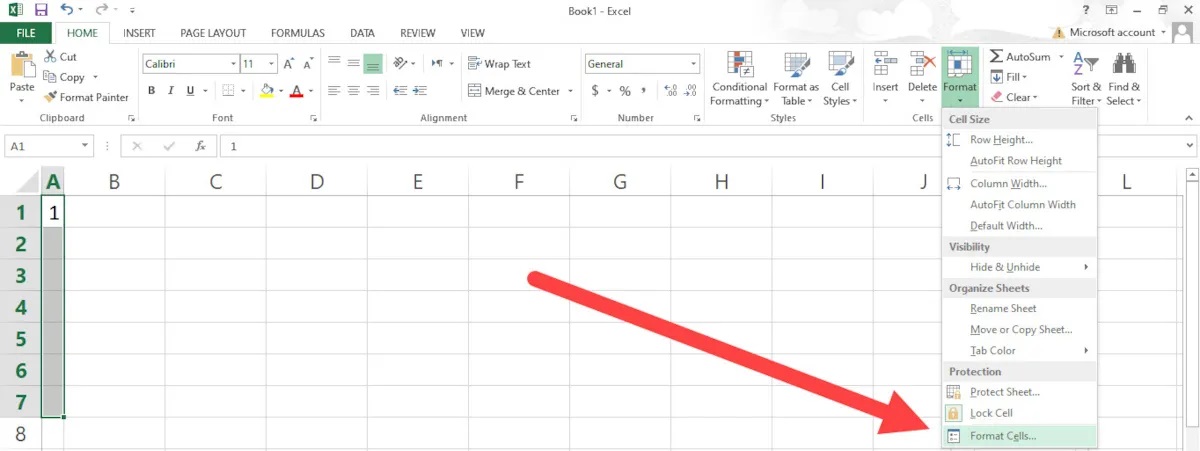 روش دیگری نیز برای تغییر فرمت سلولها وجود دارد که در همان زبانهی Home روی گزینهی Format میزنید و سپس از منو بازشده آخرین ردیف، یعنی Format Cells را انتخاب میکنید.