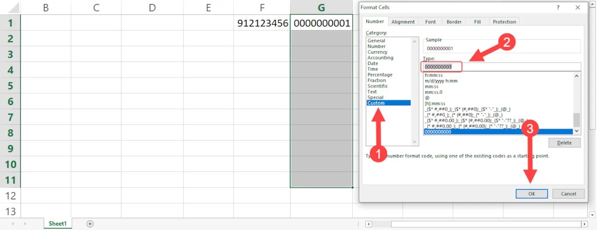 مرحلهی سوم: در باکس مربوط به Type (شماره ۲) فرمت مدنظر خود را تایپ کنید. طبق مثال، اگر قصد دارید در این سلولها شمارهی تلفنهمراه را با صفر وارد کنید، باید ۱۱ تا صفر (00000000000) بگذارید.